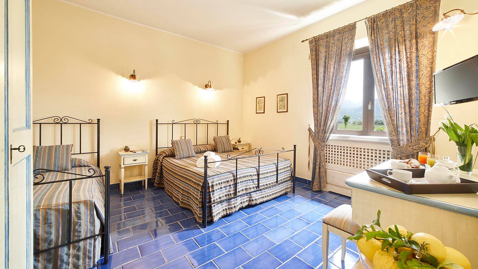 Camera composta da un letto matrimoniale e un letto singolo, aria condizionata, riscaldamento, Wi-Fi gratuita, telefono, TV a schermo piatto e bagno interno con set di cortesia e asciugacapelli.